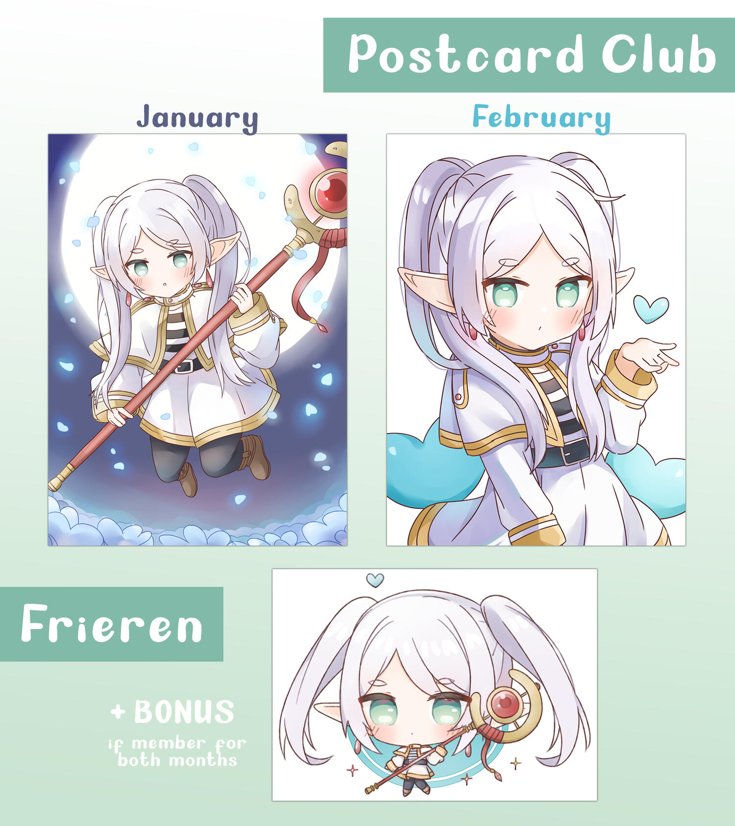 ♡ Your rewards will be shipped every 2nd month. For example, Frieren postcards will be shipped after February.